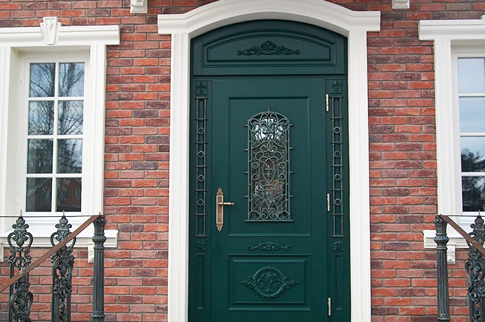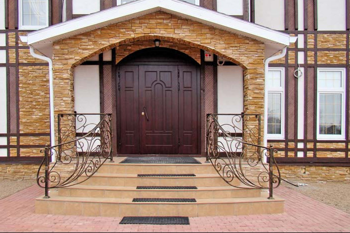 Практичность и неповторимая изысканность, утонченность и эргономичность, легкость, оригинальность и необычный дизайн, любые варианты цвета. Ассиметричные изогнутые линии, витиеватый узор, кованые вставки, флористическая роспись и витражи придадут интерьеру и экстерьеру особый шик, украсят парадный вход загородного коттеджа с отделкой из натурального камня.